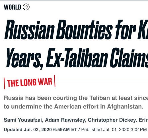 The first goal this story served was to weaponize it in the battle waged by pro-war House Democrats and their neocon GOP allies to stop Trump's withdrawal plan from Afghanistan. How, they began demanding upon publication of the CIA/NYT story, can we possibly leave Afghanistan when the Russians are trying to kill our troops? Would that not be a reckless abdication to the Kremlin of this country that we own, and would withdrawal not be a reward to Putin after we learned he was engaged in such dastardly plotting to kill our sons and daughters?