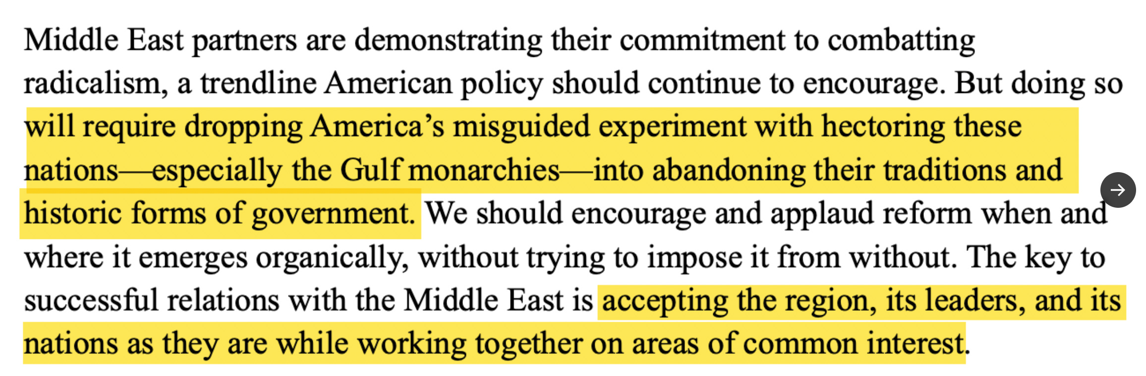 In fact, Trump’s own 2025 national security strategy released in December explicitly states that the U.S. is not going to attempt to stop repression in other countries or lecture them about the need for democratic and human rights reforms, but instead will deal with such countries as they are (that policy was designed to justify Trump’s close relationship with Saudi, Emirati, Qatari, Egyptian and Jordanian tyrants but the principle applies to Iran as well, which is at most as repressive and in fact mildly less so than those close U.S. allies).